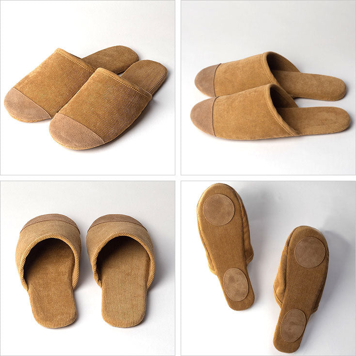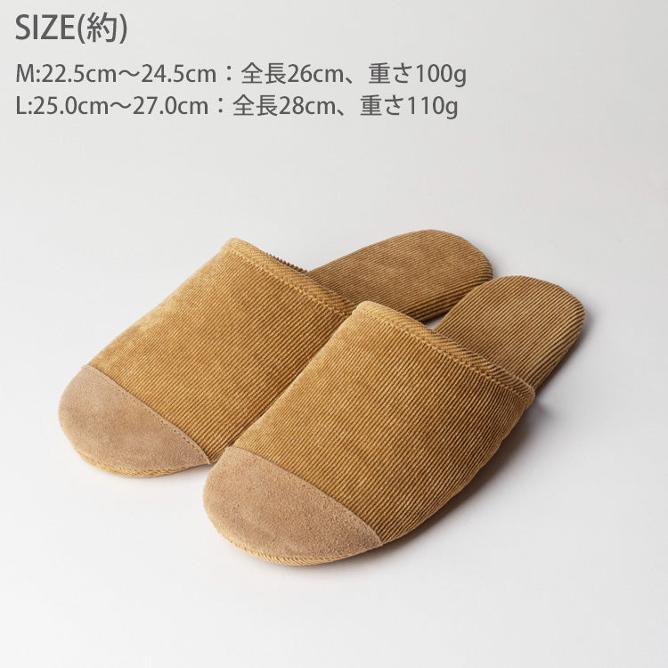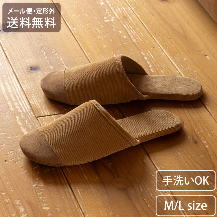 コーデュロイ スリッパ 室内 ルームシューズ 洗えるメール便 送料無料 丸洗い スエード 軽い 本革 柔らかい 軽量 静音 旅行 フィット 参観 ブラウンM(22.5~24.5)
