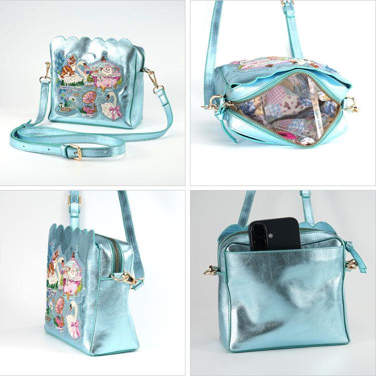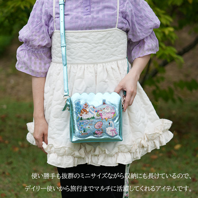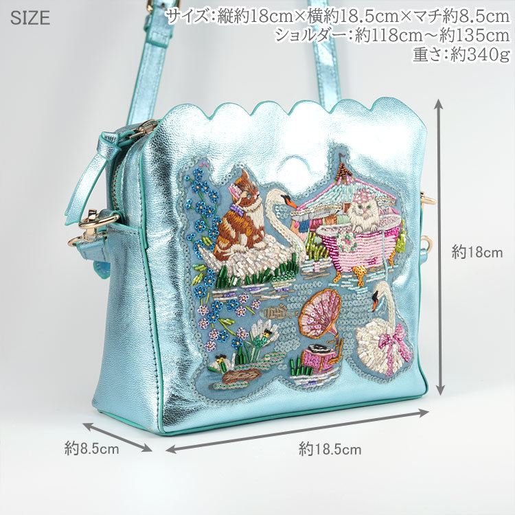 お財布ポシェット スカラップショルダーバッグ Swan Lake metallic blue SHO3881 送料無料 タマオワールド ショルダーバッグ ネコ スワン 革 バッグ ポーチ 刺繍 動物 かわいい
