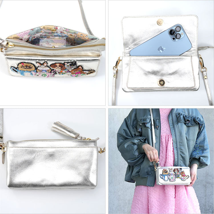 カップやティーポットに入った動物たちの刺繍がユニークな多機能お財布ポシェットです。