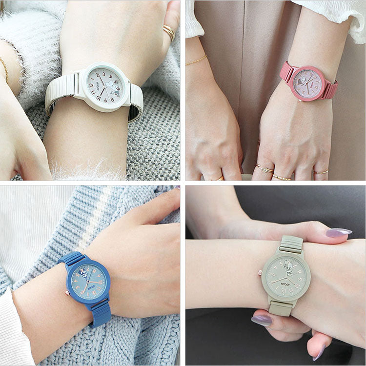 やさしい色合いの文字盤に、ムーミンたちのアートが描かれた可愛らしい腕時計です。