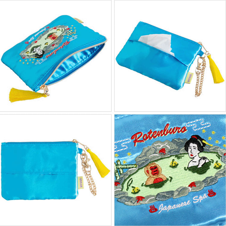 MYUUA(ミューア)ブランドの、あっつあつが美味しい石焼ビビンバと、猿と温泉に浸かる様子が描かれた総刺繍したポーチです。
