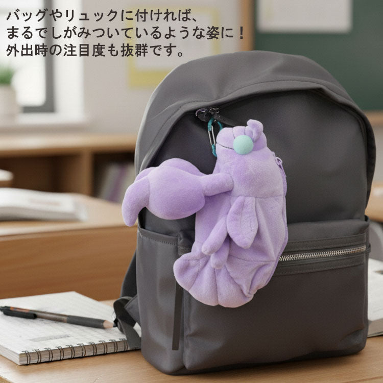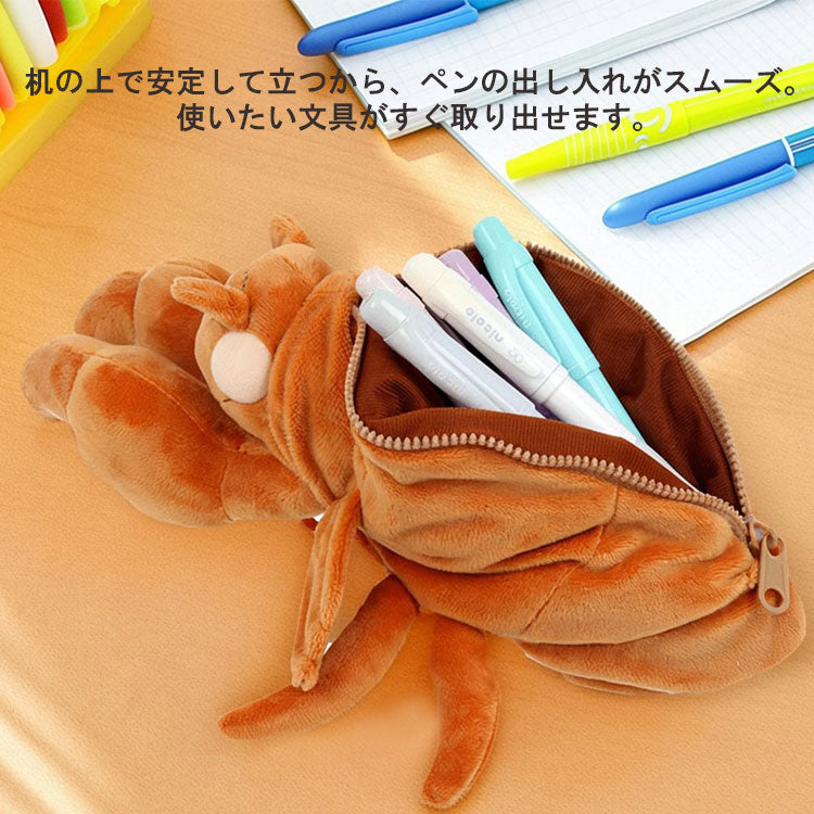 見た瞬間くぎづけ!思わず笑顔になる“せみ”のぬいぐるみペンケース。ふわふわ素材で癒される見た目ながら、機能性もばっちりのスタンドタイプです。