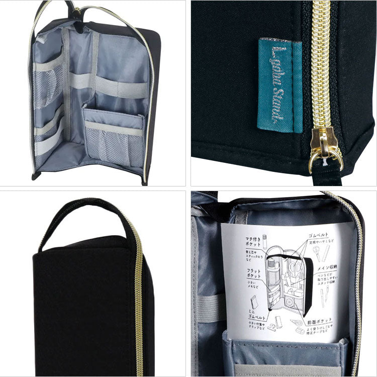 内部には3つの小物ポケットと4つのゴムバンドが付いており、消しゴムや付箋、USBなどの小物もすっきり整理可能。スタンド型だからデスクの上でも省スペースで使えます。