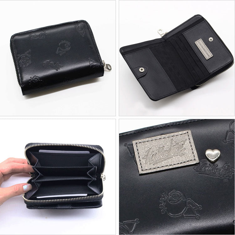 自称マイメロディのライバル。乱暴者に見えるけれど、実はとっても女の子らしい!? かっこいいい男の子がだーい好き。黒いずきんとピンクのどくろがチャーミングポイントの「クロミ」型押しの二つ折り財布です。