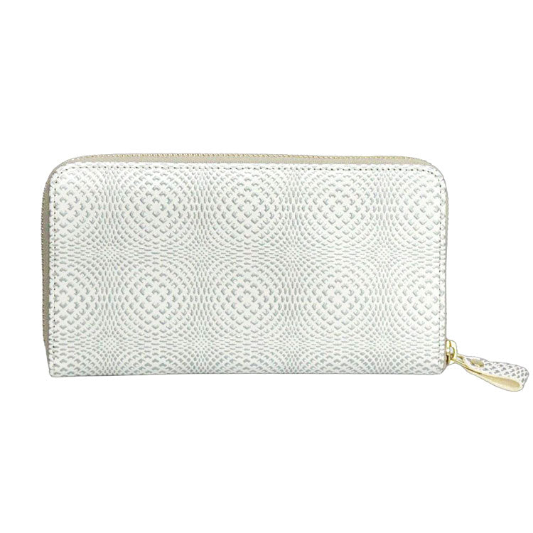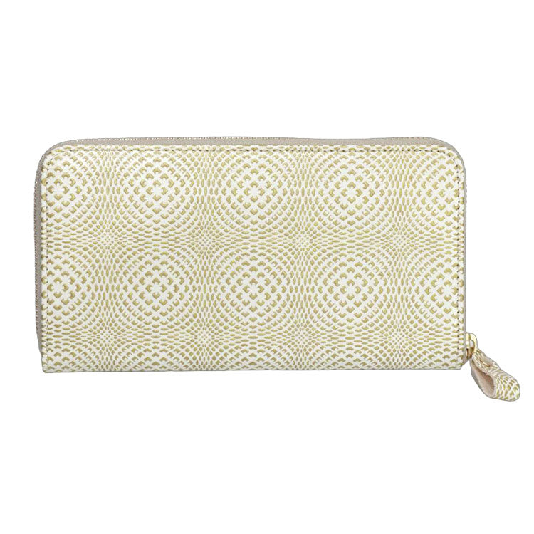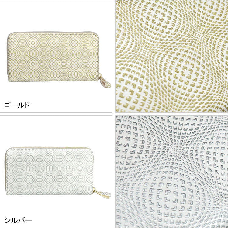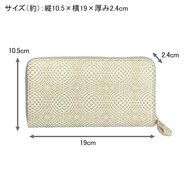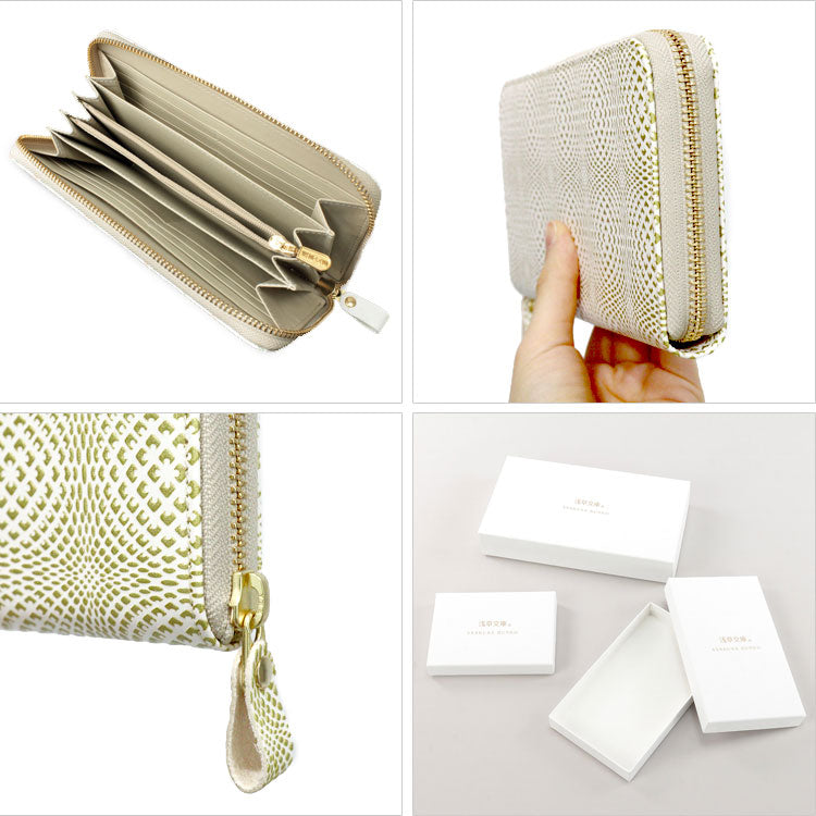 色数が多い浅草文庫の中で、一色のみの珍しい構成です。市松模様を変形させて、菊の様に見せるコンテンポラリーなデザインで、金彩と型押しのみで表現しています。コの字型のファスナーが開け閉めしやすい、スタンダードな長財布。扇マチでしっかり開き、大容量でありながら閉じればすっきり見えます。小銭入れのファスナー引き手も使いやすい大きさを考えて開発した、オリジナルです。