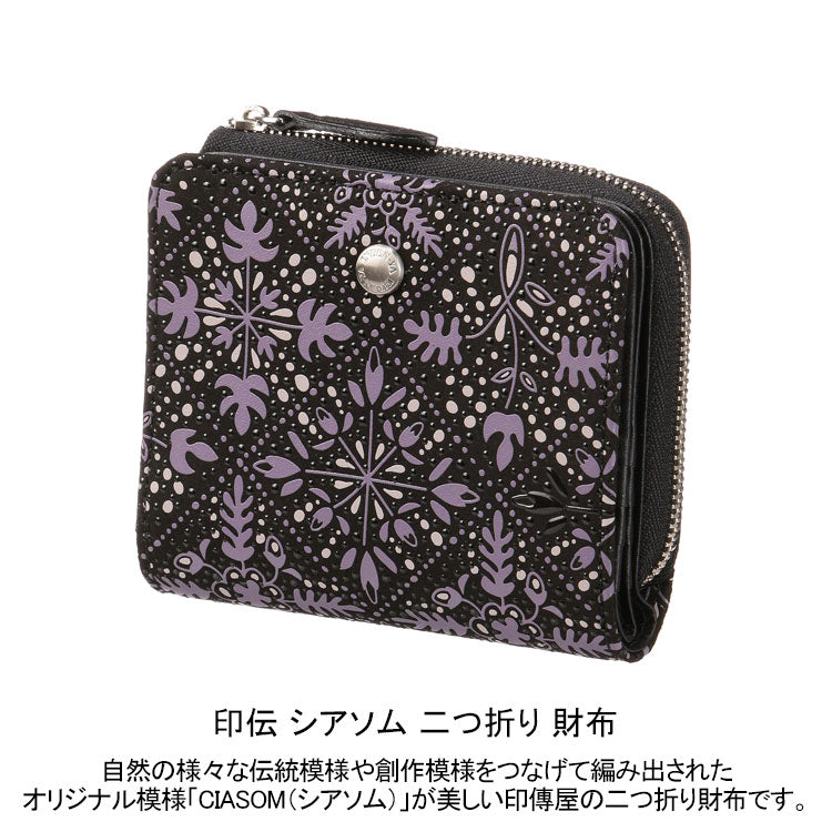 自然の様々な伝統模様や創作模様をつなげて編み出されたオリジナル模様「CIASOM(シアソム)」が美しい印傳屋の二つ折り財布です。世代を問わず手になじむデザインの財布なので、プレゼントにも最適です。