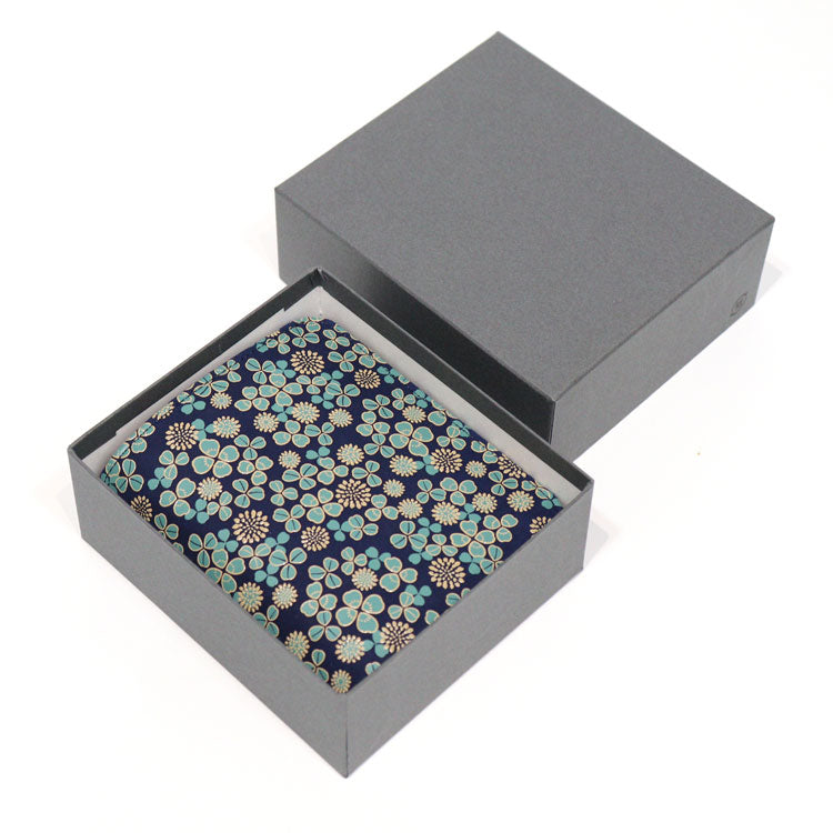 「白詰草」の模様 紺の鹿革に、三つ葉とこんもりした花をパステルグリーンの更紗と白漆でつくり上げた印伝屋のオリジナル模様。